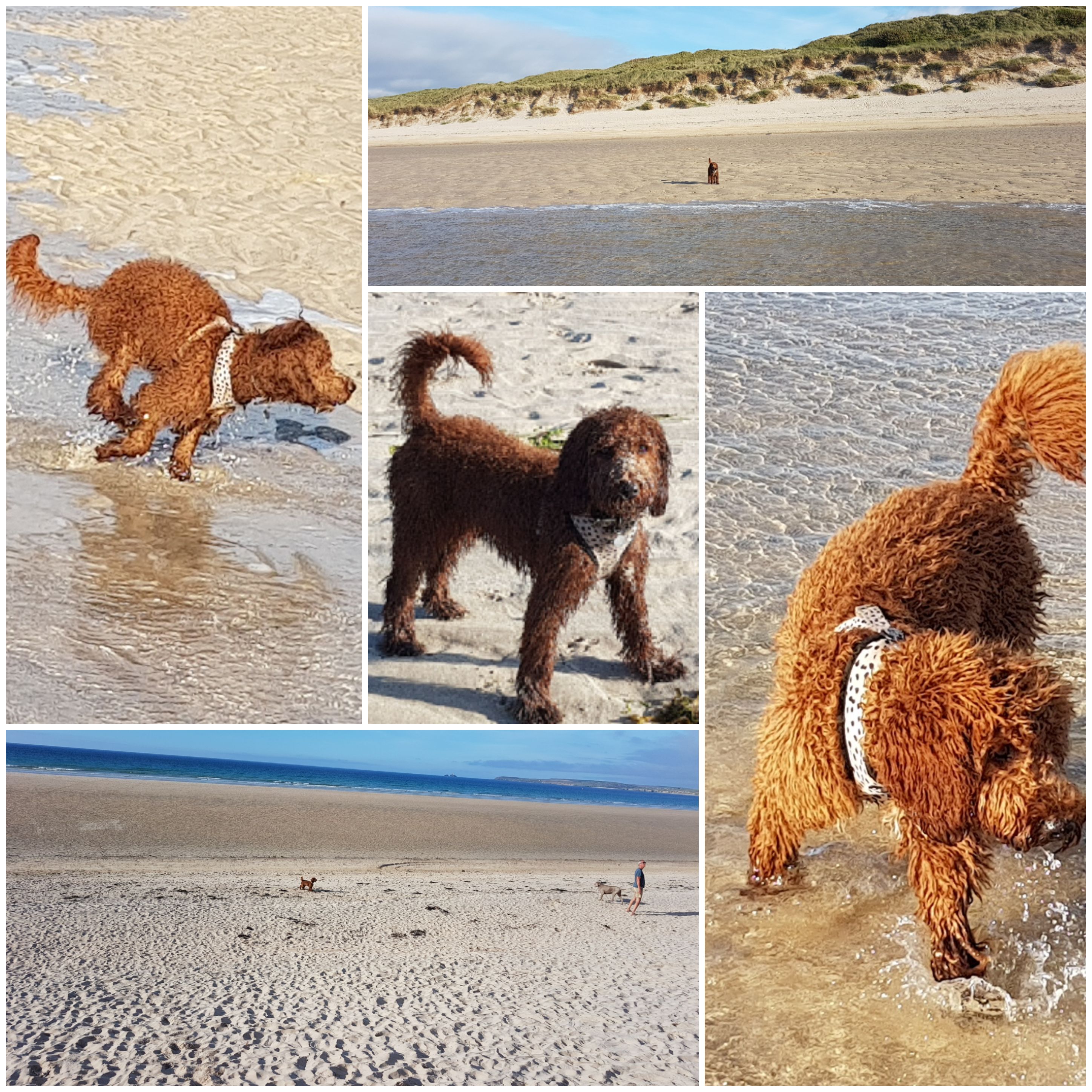 🐶💛⛱🌲Six month Pup Winnie is having a wonderful time, walking, playing, and splashing about at Porthkidney Sands; we took her water bowl with us, as she likes to keep well hydrated 🌊💧🐾