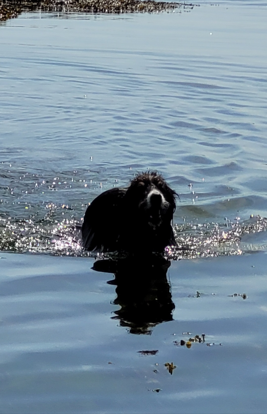 🐶💙 🐾 Happy Pup Charlie ….had a wonderful week.He told me what he would like to do, where to go, and I gave him what he wanted!…🐶💛He loved playing fetch non stop in the garden (if he could), with his purple doughnut, crocodile, or a long game of fetch in the sea with his ball.🐊🥯🏀He took me on long walks, to the huge Country Park nearby, and enjoyed the Coves at Brixham after the Pirate Festival⛵️☠️ shenanigans,..and appreciated lots of bowls of water and sprats along the way 💧🌊🐟🐕🐾