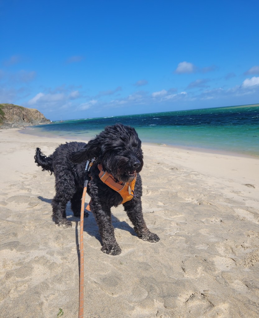 🐶💙🌞Dylan..windy fluffy doggy …loving his walk by the gloriously beautiful stripey blue sea and soft silky sugar sand ⛱️🌊🐾💧😍
