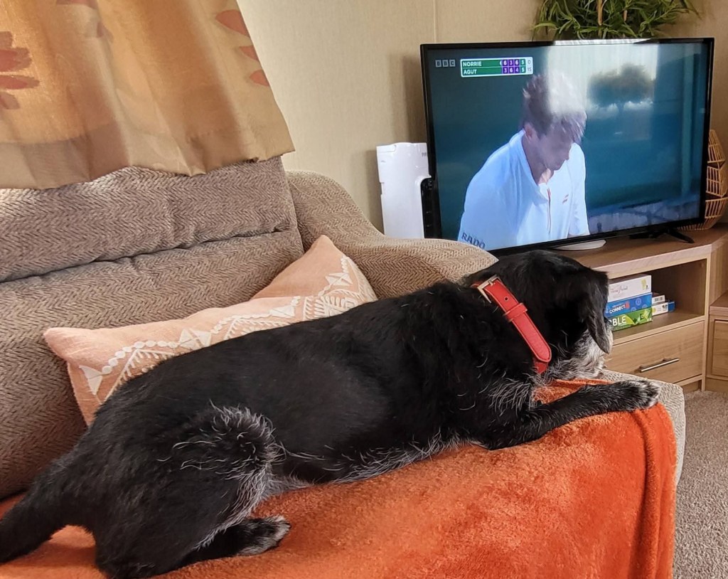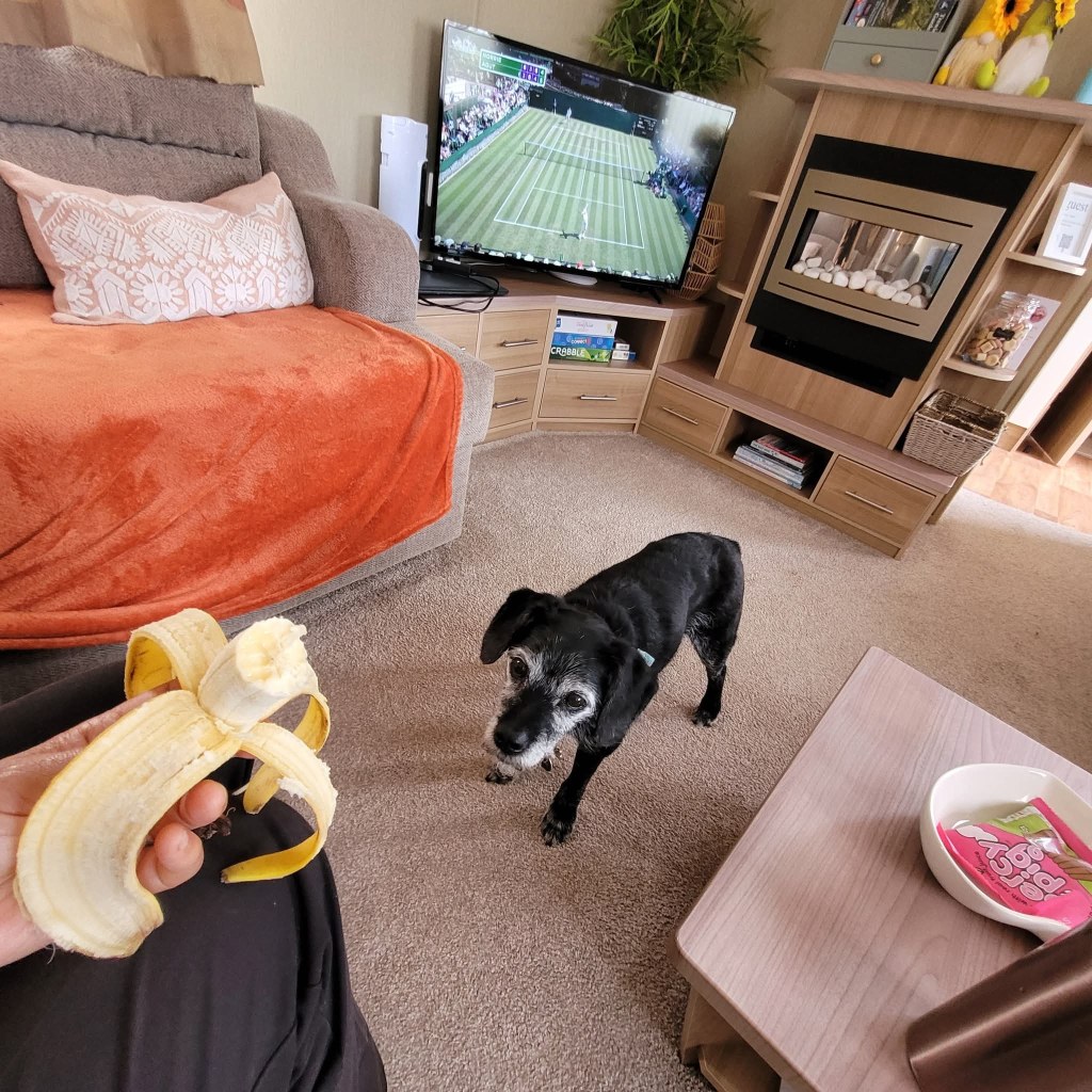 ..Harry watch the match..not my banana..π₯.ππ….πHarry would like to enter the dog veterans wimbledon draw….with real balls…..not flour π₯πππΎHarry happy playing fetch brussel sprout, ball and space hopper…..both he, Izzy and Dave are loving back, neck massages, ear rubs.and .treatsHarry enjoying a leg massage..he is 150 years old……Happy…cool for pupsπ§ππππ₯π₯ππ